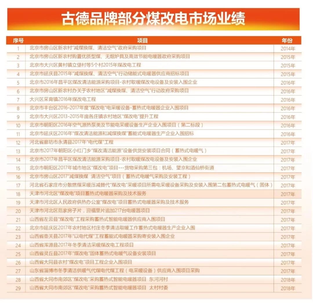 在众多的电采暖产品中,钴得暖业的蓄热式电暖器在近几年北京煤改电工程中,不断取得骄人的业绩,成功入围北京各区县的煤改电工程,取得了辉煌的成绩。入围北京市2015年“减煤换煤、清洁空气行动”第二批生产企业推荐名录,入围2015年生产企业名录。是2014年、2015年房山区“减煤换煤、清洁空气行动”政府采购中标单位,2015年延庆煤改电中成功入围企业并中三个标段,2015年北京市石景山、通州、门头沟区、大兴煤改电电暖器供应企业,2016年的北京煤改电在房山区、丰台区、朝阳区、大兴区、昌平区、延庆区有几万台的蓄热室电暖器的销售。2017年入围河北省石家庄煤改电项目、廊坊地区永清煤改电项目、北京朝阳区农村煤改电项目、房山农村煤改电项目、昌平区煤改电项目、延庆区煤改电项目、山西太原、临汾等等直到目前不下10万台订单。