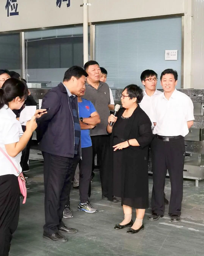 在钴得暖业曹妃甸生产基地,尹玉霞给来公司调研的领导介绍公司发展情况。